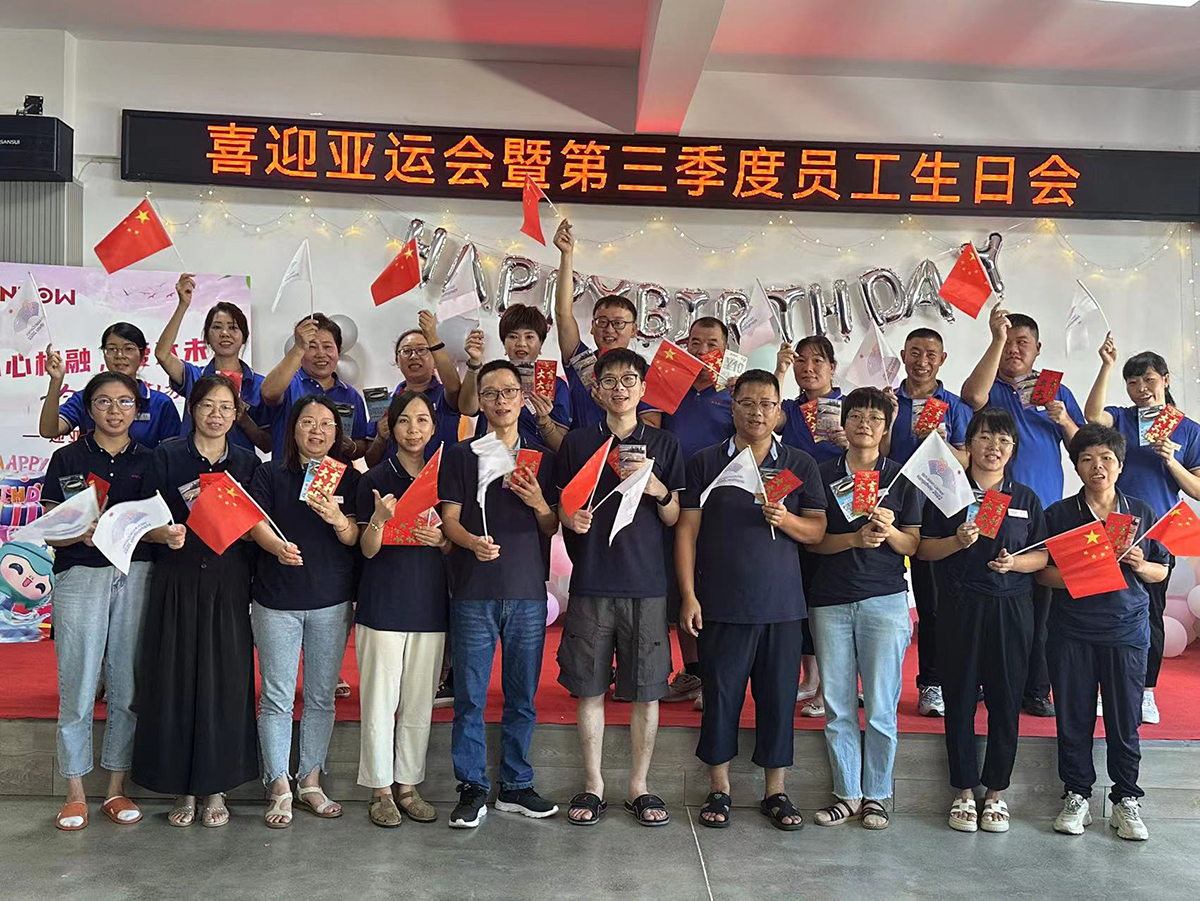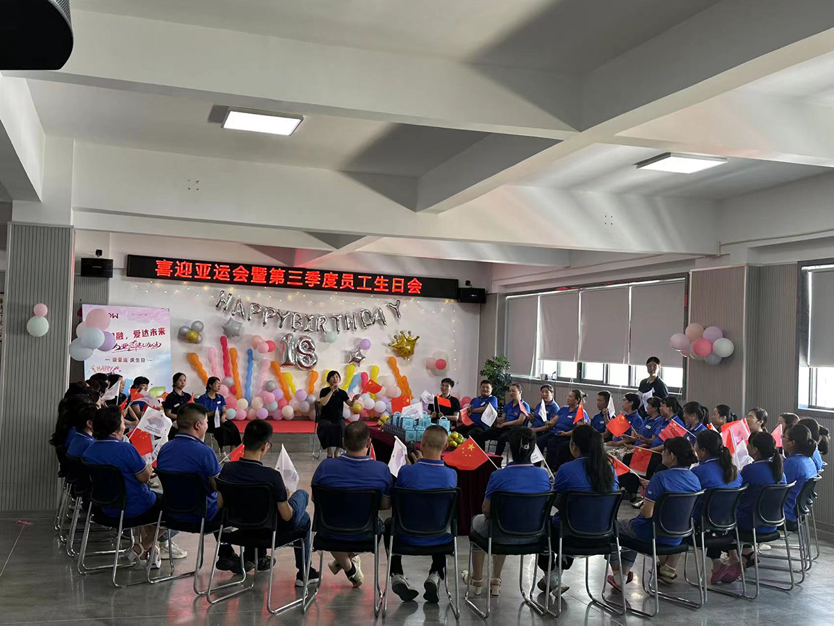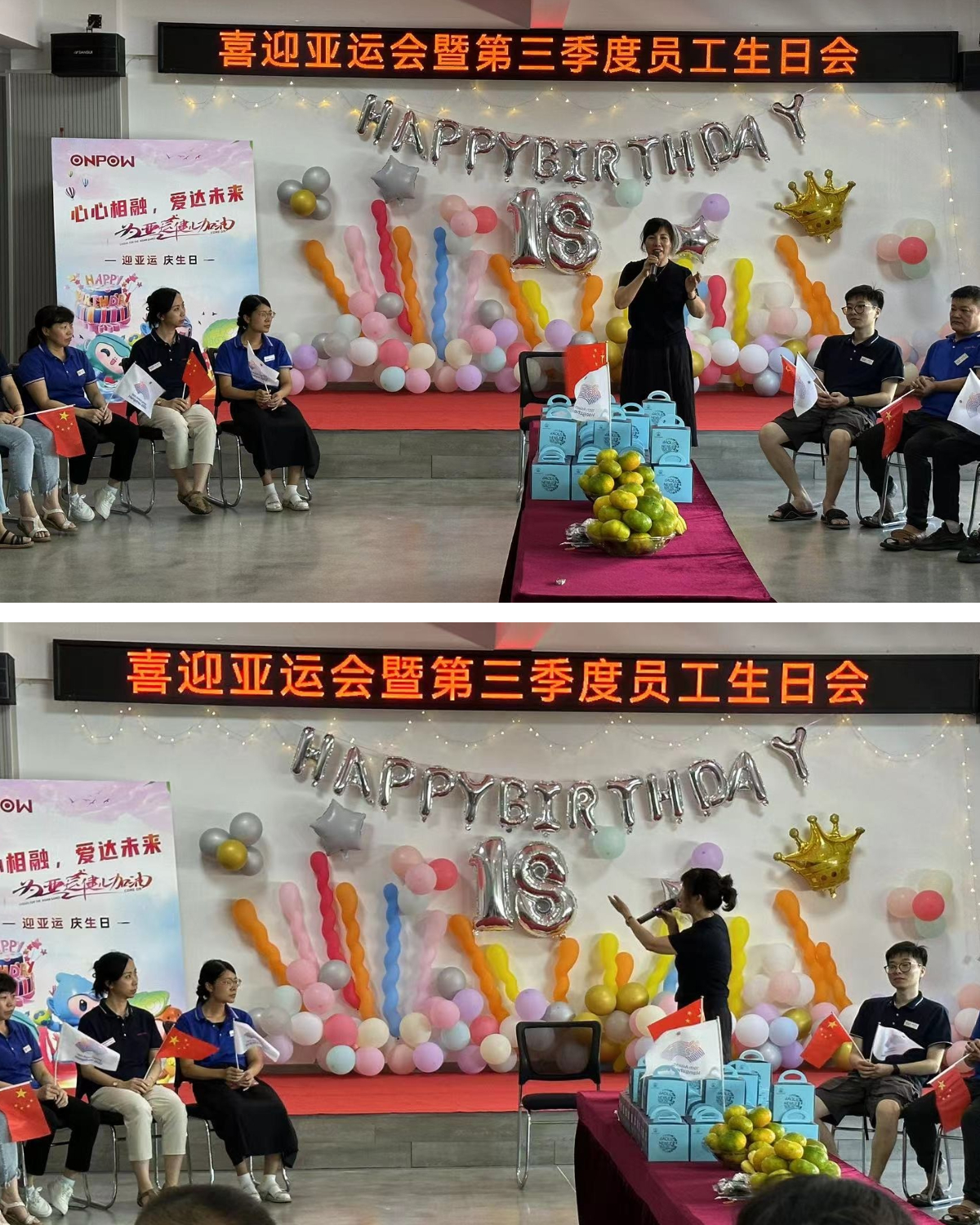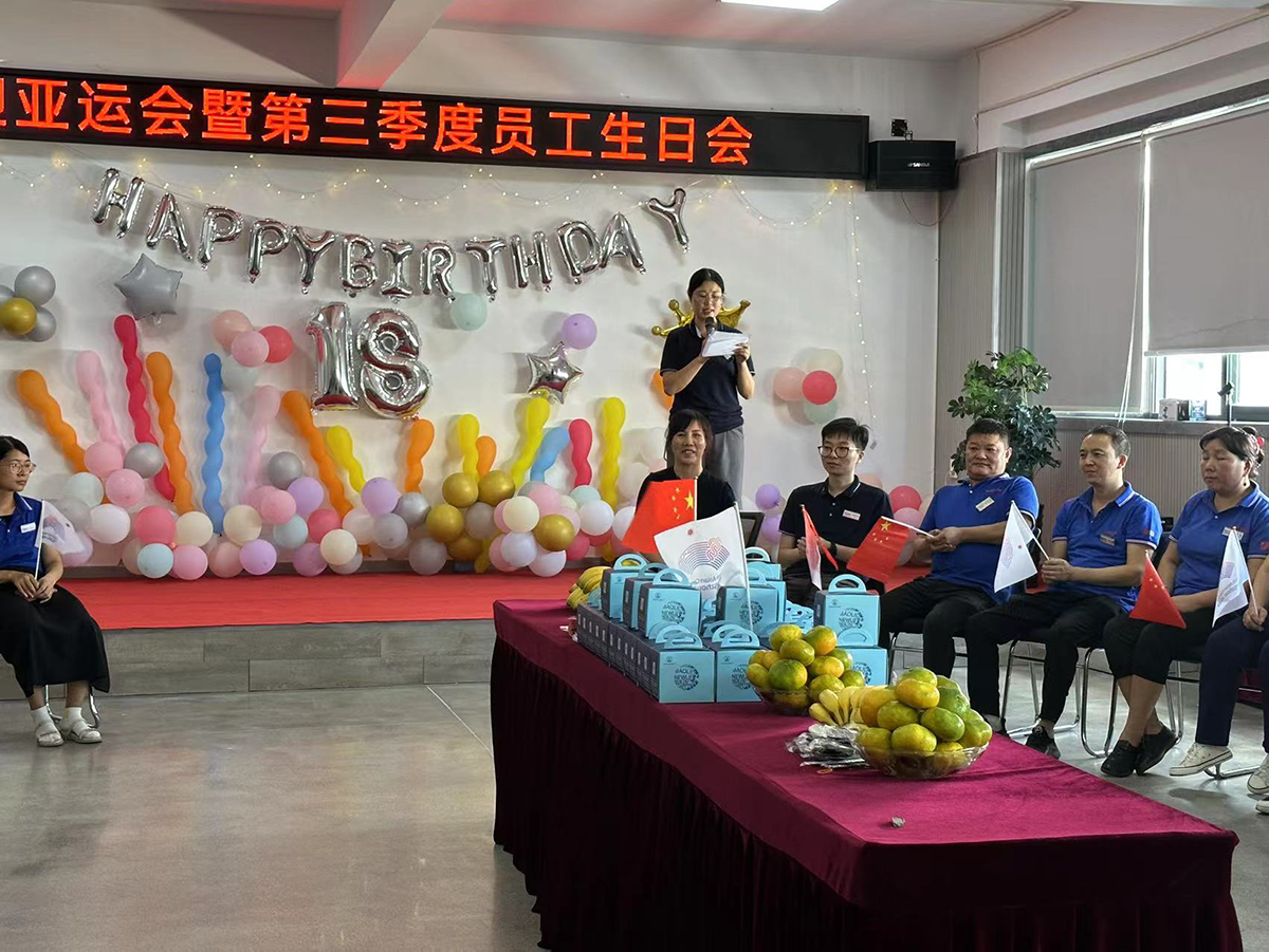 环节二:倪董为寿星们致生日贺词。一份祝福,一份真诚,在这个特别的日子里,倪董代表公司股东携全体员工为寿星们送上最真挚的生日祝福,祝大家生日快乐!愿所有的幸福、温馨、好运都永远围绕陪伴着你们;公司有今天的发展,离不开同仁们的辛勤付出,默默工作,心表感激;同时祝大家工作愉快,明天更加美好;今天的集体生日会正好赶上杭州第19届亚运会,“心心相融,@未来”,大家齐聚一堂,共为亚运健儿加油!