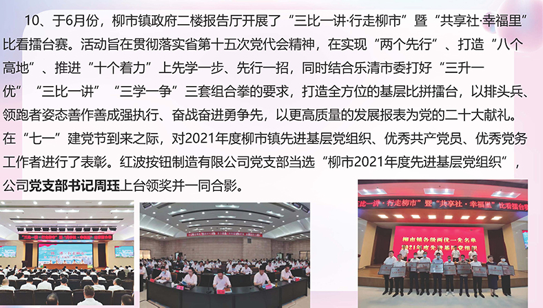 优秀工作者代表(郑晓洁)和先进工作者代表(张金梅)分别上台发表讲话。她们说:“荣耀属于昨天,重要的是今天和明天。”“我们不能辜负领导的期望,严格要求自己,本着责任、高效、严谨的态度,做好每一份平凡的工作。” 倪董语重心长地说: “今天两位代表讲话,讲到了大家心坎上,工作要踏实肯干,坚持严把质量关,客户至上,精益求精,勇于创新,敢于担当,坚持以求实,勤奋,认真的工作态度,向“卓越,高效”的目标前进,以“红波”人的精神,打造全球优秀的按钮开关企业。”